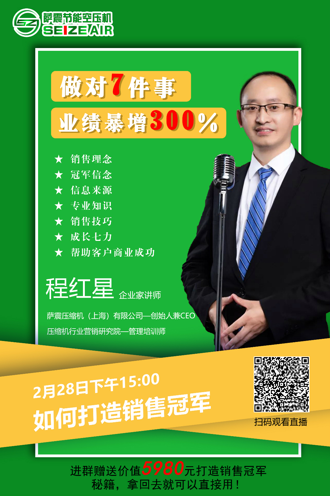 薩震節能空壓機程老師每天15點準時開講《營銷創新的7大秘訣》,
