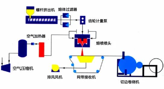 熔噴布是采用高速熱空氣流對模頭噴絲孔擠出的聚合物熔體細流進行牽伸,由此形成超細纖維并收集在凝網簾或滾筒上,同時自身粘合而成為熔噴法非織造布。