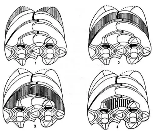 我們以螺桿空壓機為例,螺桿壓縮機的工作循環可分為進氣,壓縮和排氣三個過程。隨著轉子旋轉,每對相互嚙合的齒相繼完成相同的工作循環。