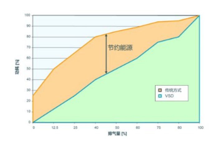 絕大多數的使用工況下,用戶的壓縮空氣需求量存在巨大的波動。傳統的空壓機是通過調節空壓機的進口閥門來調節空壓機的流量,使空壓機的實際產氣量和用戶的實際需求達到平衡。這種調節方式的調節效率很低,導致大量的能源浪費。變頻調速空壓機是通過調節電源的頻率來調節壓縮機電機的轉速,進而調節空壓機主機的轉速使空壓機的實際輸出氣量和客戶的實際用氣量達到一致。該流量調節方式可以避免進口流量調節方式中大量的能源浪費,是目前市場上效率最高的空壓機流量調節方式。