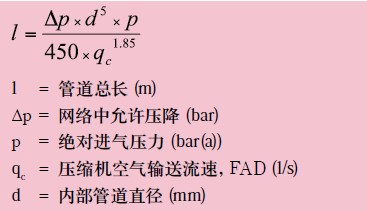 管道網(wǎng)絡(luò)中特定壓降,最長的允許長度可以使用下列計(jì)算公式,薩震節(jié)能空壓機(jī)與您一起計(jì)算下: